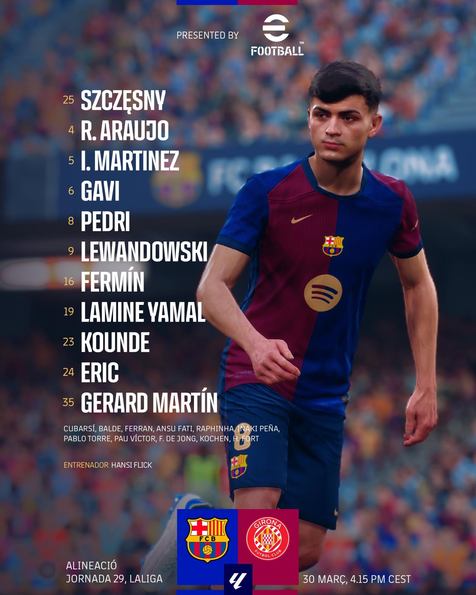 巴薩替補:13-佩尼亞、31-迭戈-科亨、2-庫巴西、3-巴爾德、14-巴勃羅-托雷、18-保-維克托、21-德容、7-費蘭-托雷斯、10-法蒂、11-拉菲尼亞、32-赫克托-福特